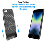 Looking for that all-in-one carrying solution for your phone? The high-quality build with its smart design allow you to carry your iPhone 7/8/SE 2020/SE(2022) around easily and comfortably. Slim, stylish design features rugged skin tough enough to handle bumps, scratches and shocks.This swivel holster and rear cover is exactly what you need. Rubberized Swivel Holster with Rear Cover Shell included. Allows your phone to be worn on a waistband or belt and can be taken off of the belt clip without removing it. A locking swivel belt clip is easily locked into an extended position and provides different viewing angles while watching movies or video calls, also rotatable 180 degrees. The case can be also be used with holster or as a separate, slim carrying solution. Advanced locking mechanism securely holds phone in place. Precisely cut to preserve full use of volume buttons, charger, camera, microphone, headphone jack, and all other ports.