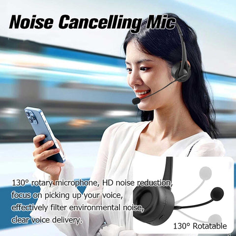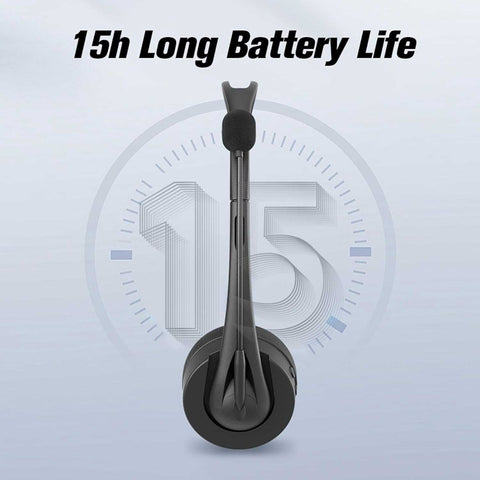 Over the Head Wireless Headset with Boom Mic. The Headset features Noise-Canceling Technology for crystal clear conversations. Blocks more external environmental noise compared to other wireless headsets. The over-head design allows this hands free unit to balance on your head reducing fatigue. Talk Time: Up to 15 Hours, Standby Time: Up to 220 Hours. Secure connectivity up to 32 feet away. Easy pairing, Hearing aid compatible, Balanced & Lightweight, Weight: 1.7oz. NOTE: This is a MONO headset with one earphone.
